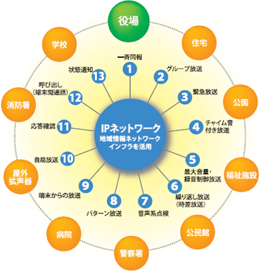 地域IPネットワーク網を活用して、役場から住民へ、J-ALERT・地震・台風・豪雨・津波などの災害時緊急放送や行政放送を行なえます。