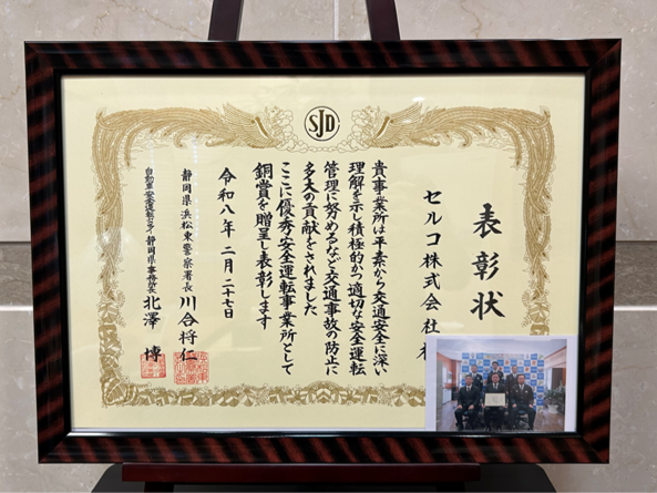 浜松東警察署より「優秀安全運転事業所」として表彰状をいただきました。 今後も一人ひとりが安全運転に努めてまいります。